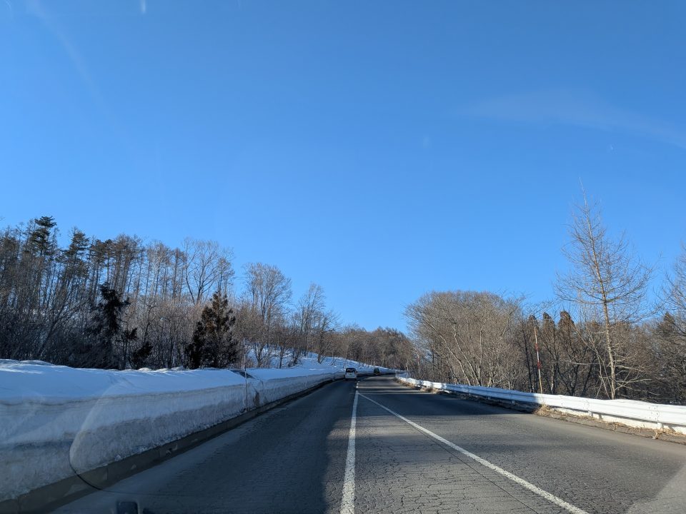 上信越道信濃町インターから黒姫や杉ノ原へ向かう道路に雪はありません。